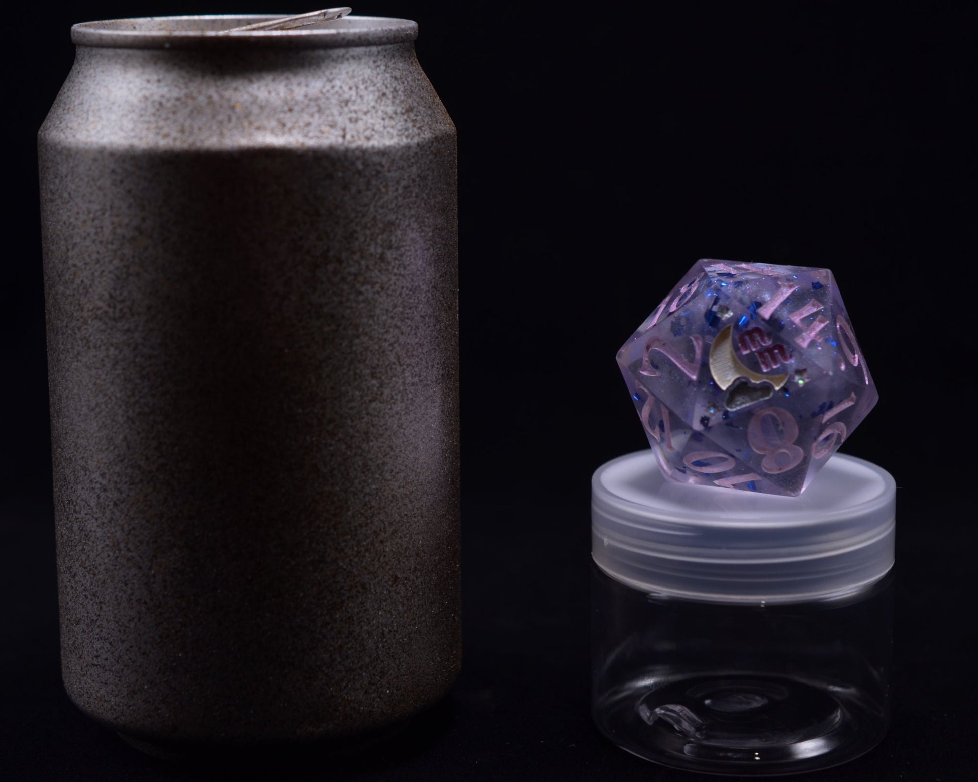 Item is made of epoxy resin and features blue metal foil suspended in a sea of platinum shimmer resin. Dice numbers are gentle pearlescent pink.