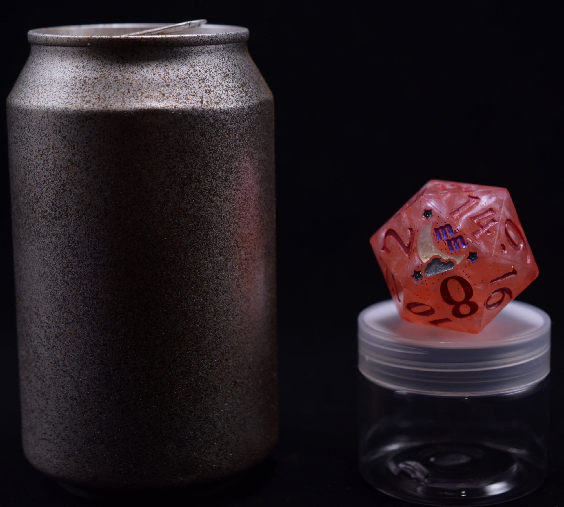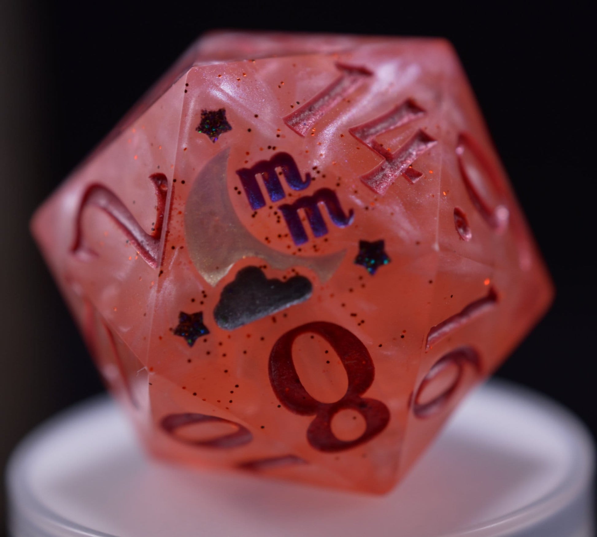 Handmade oversized/boulder-sized/45mm D20, featuring store logo design as the 20 face.
