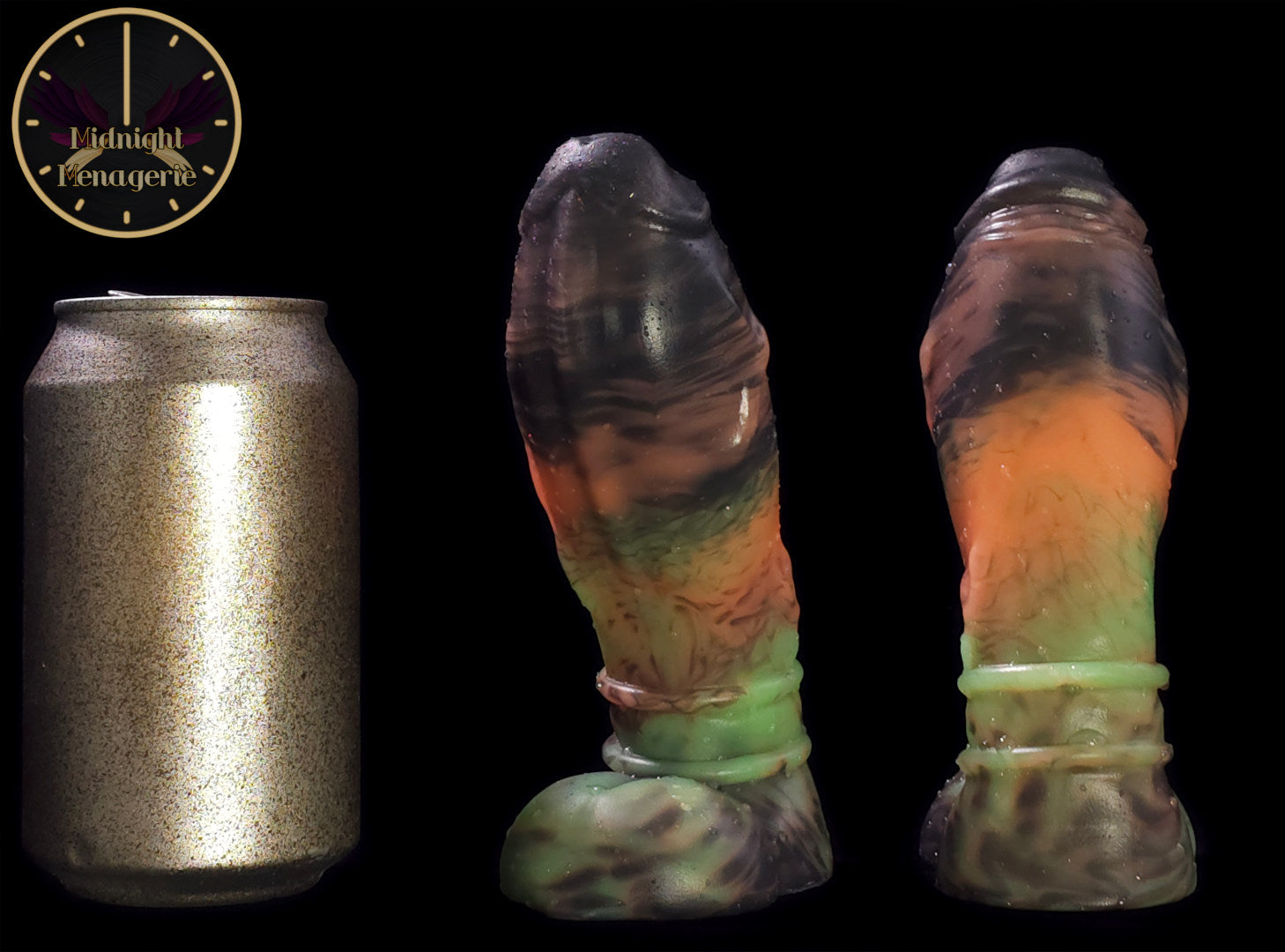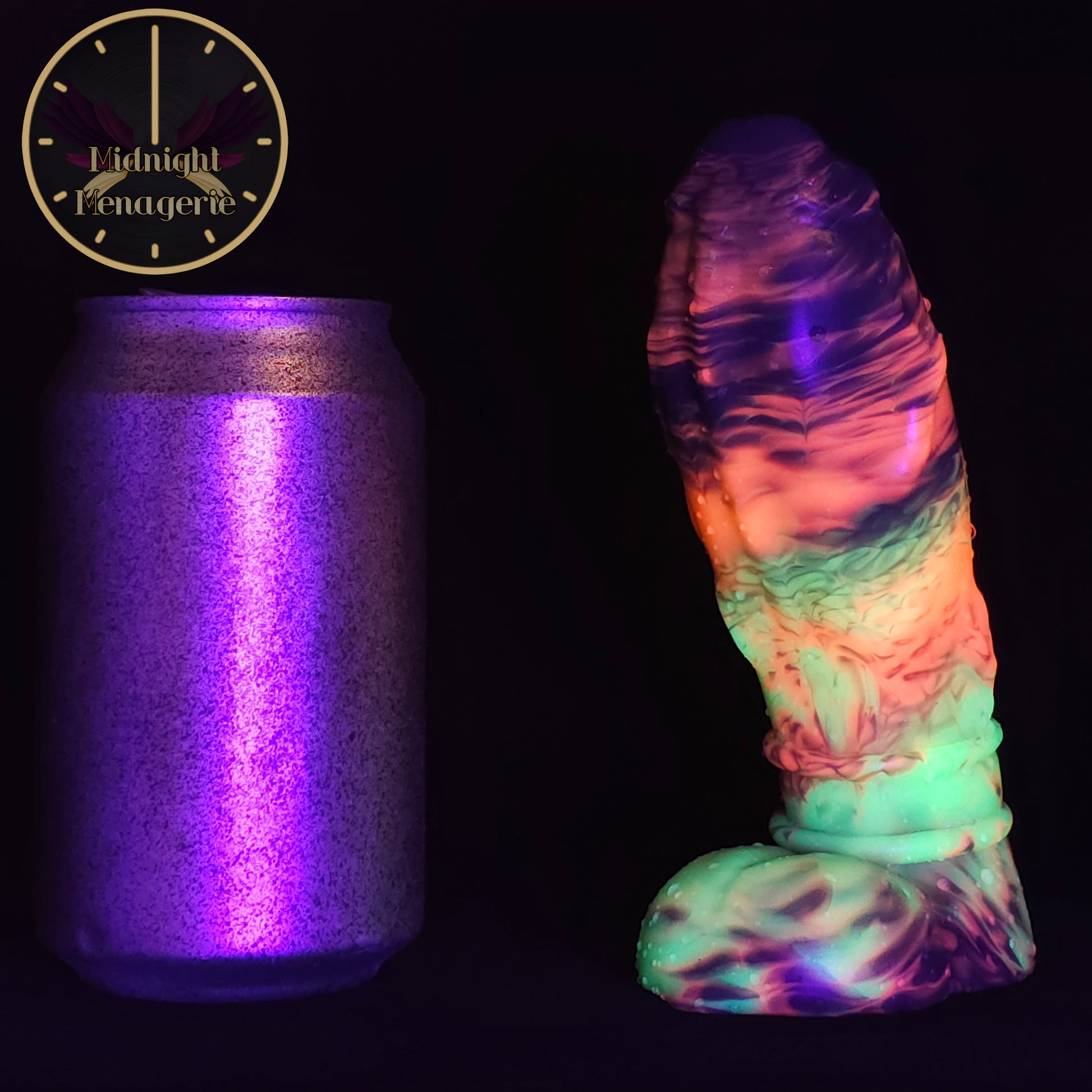 Item is coloured in a 3-colour marble of UV-reactive green, UV-reactive orange, and black.