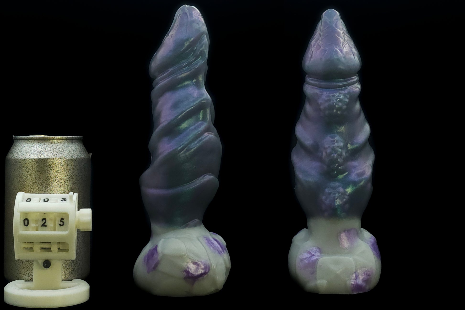 Item is coloured in a "space cow" theme - hypershift pigment split with a mid grey with purple patches. Varying the angle and intensity of the light hitting it will produce the colourshifting effect.
