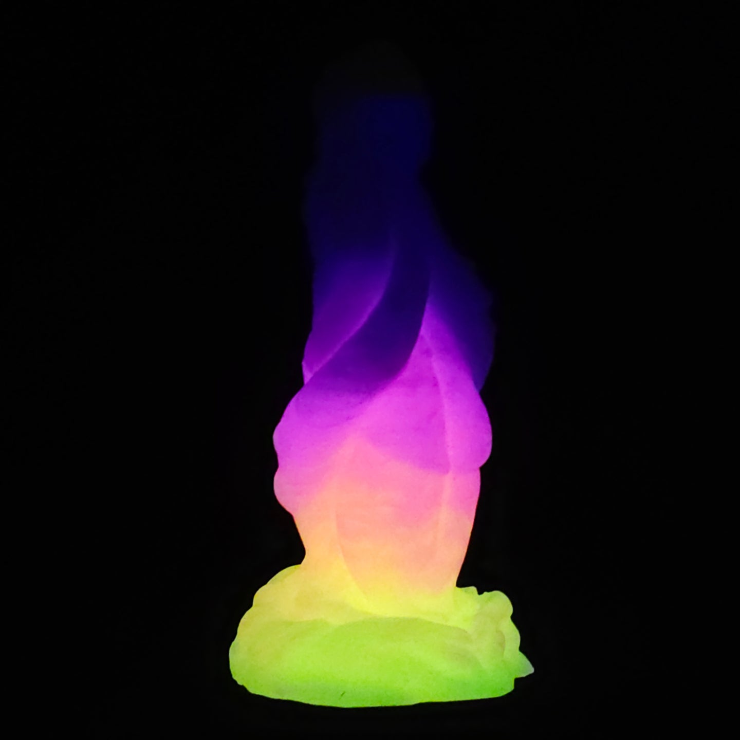 Item has an opaque white drip over a fade from electric purple to UV pink finishing in UV yellow. The pink and yellow are also glow-in-the-dark.