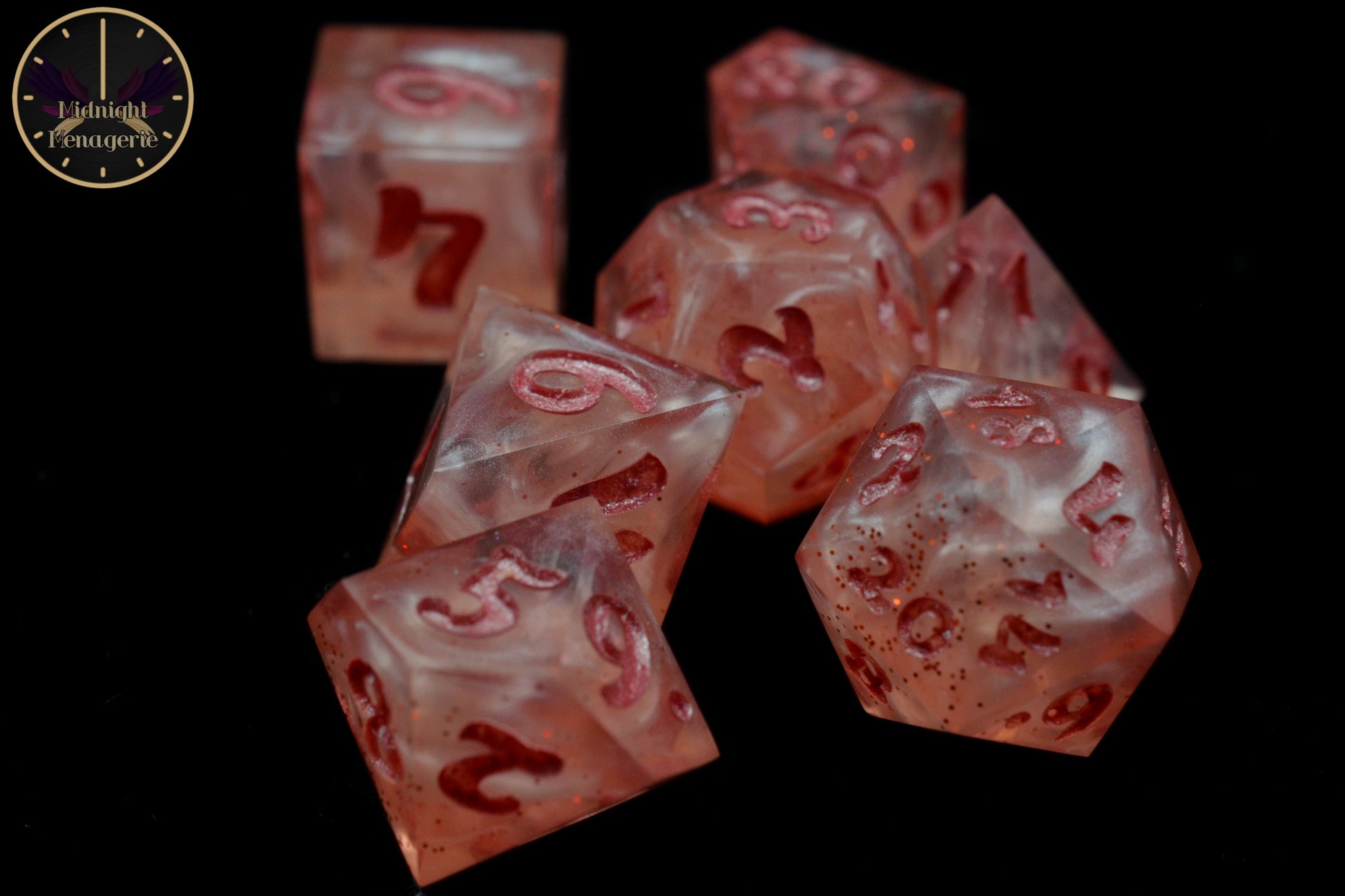 RPG 7-die handmade sharp edged resin polyhedral dice set + handmade dice bag.