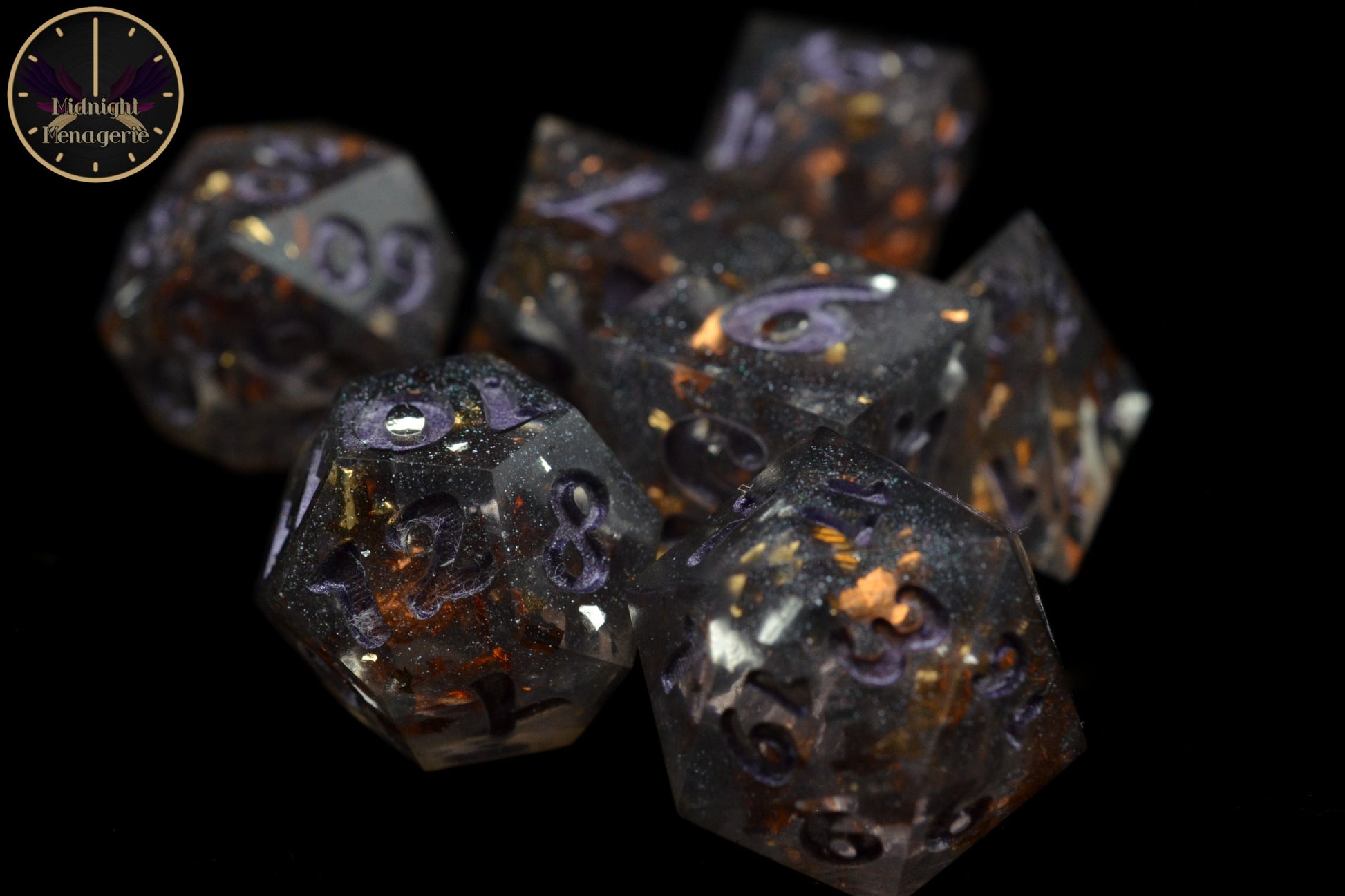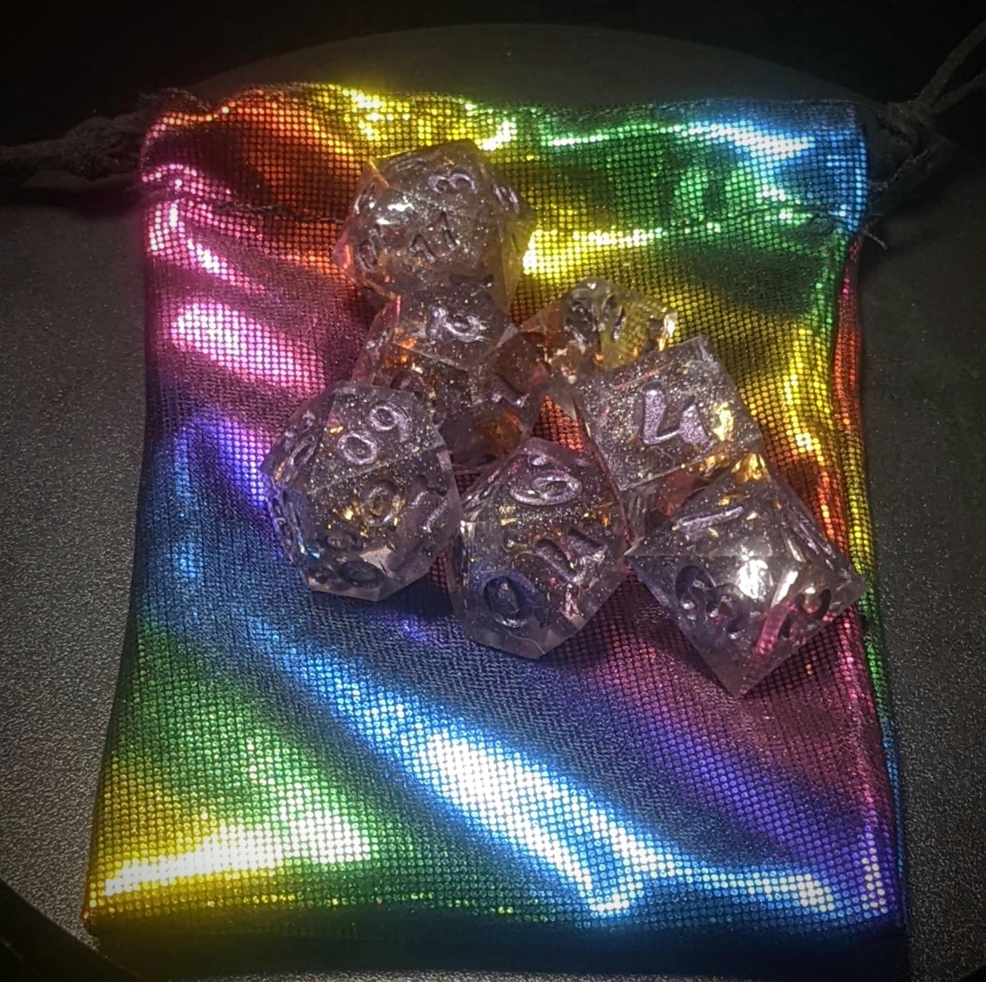 RPG 7-die handmade sharp edged resin polyhedral dice set + handmade dice bag.