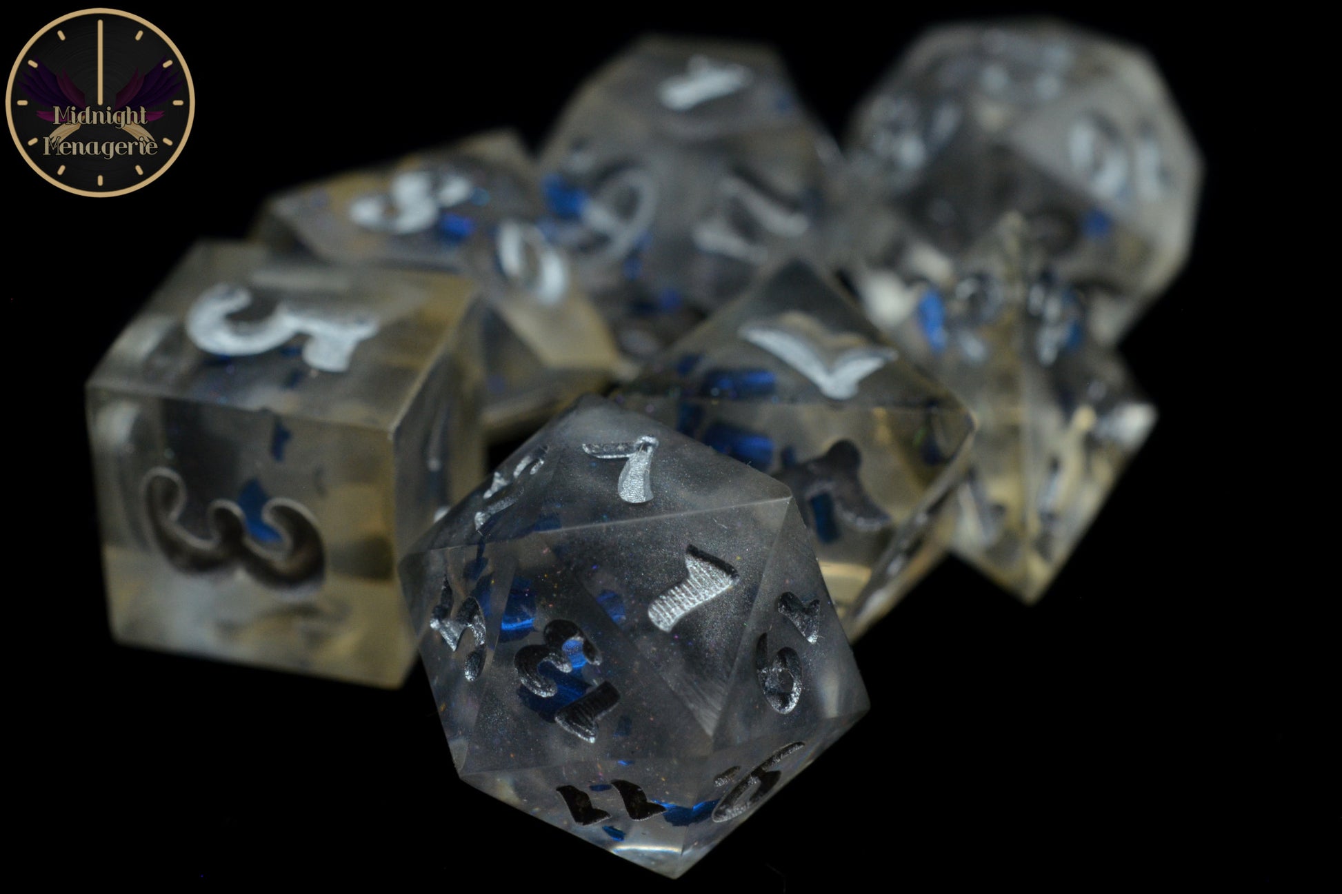 Dice feature a mix of clear resin with "cloud" shimmer alcohol ink and blue leafing foil, and are inked in silver.